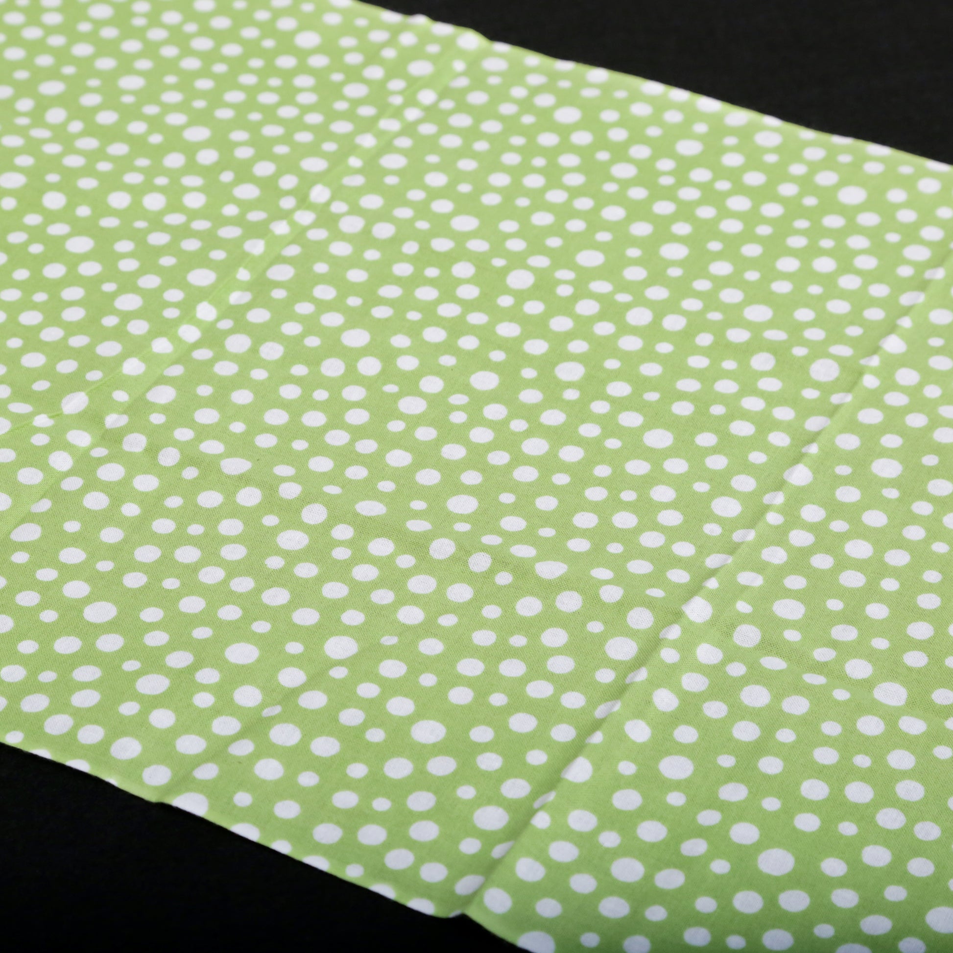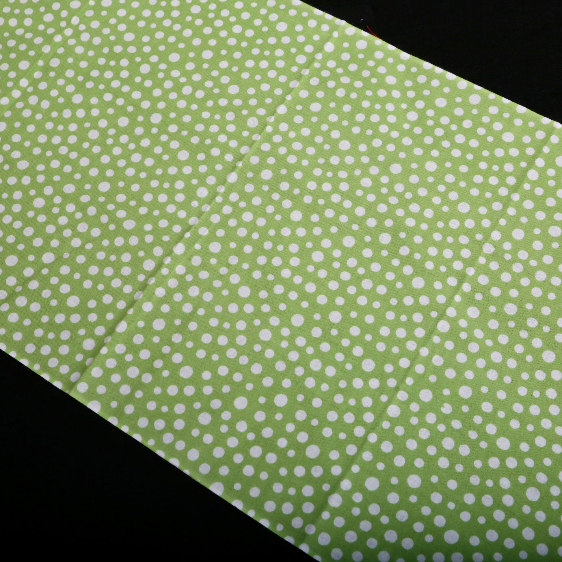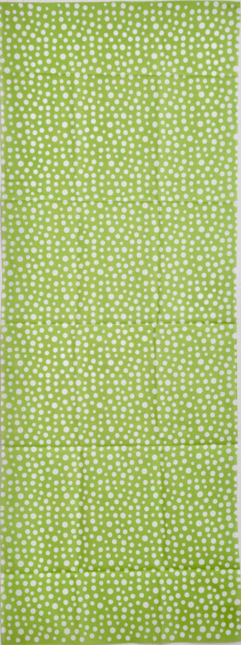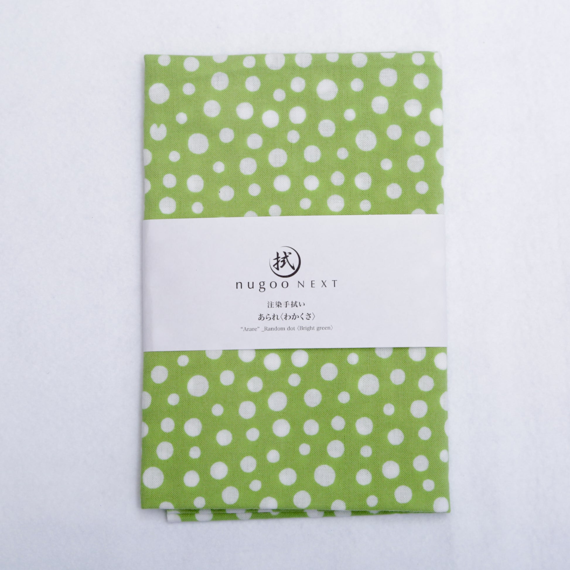 日本古来のシンプルな柄で「霰(あられ)」を表現したものです。白い生地に大小のあられ紋様を全面に染めています。霰紋様は、途切れることがないため無限の広がりといった意味が込められています。の裃かみしにも用いられました。現代でも小紋の1つとして人気の柄です。色は、わかくさいろ。あの「ずんだ」の美味しそうな色です。注染の柔らかい表情と楽しみ、とても和を感じる手拭いです。